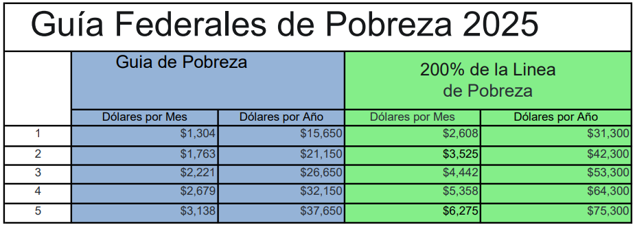 -estar mas bajo de 200% de la Linea Federal de Pobreza (basado en sus ingresos anuales y cuantos dependientes tienes)